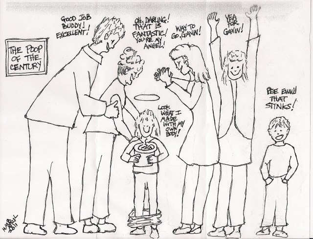 CLASSIC moment of sweet little Gavin showing us the fruits of his labors in the bathroom, and proudly explaining “I made this with my BODY” and pointing to his bum.  And all of us going insane with happiness over it (especially those who would have otherwise had to deal with an extraordinarily full, moist, and aromatic pullup).  Except of course for the boy cousin who says “Pee-eww!  That stinks!” offering not one speck of empathy even though he’s just been through the same stage.