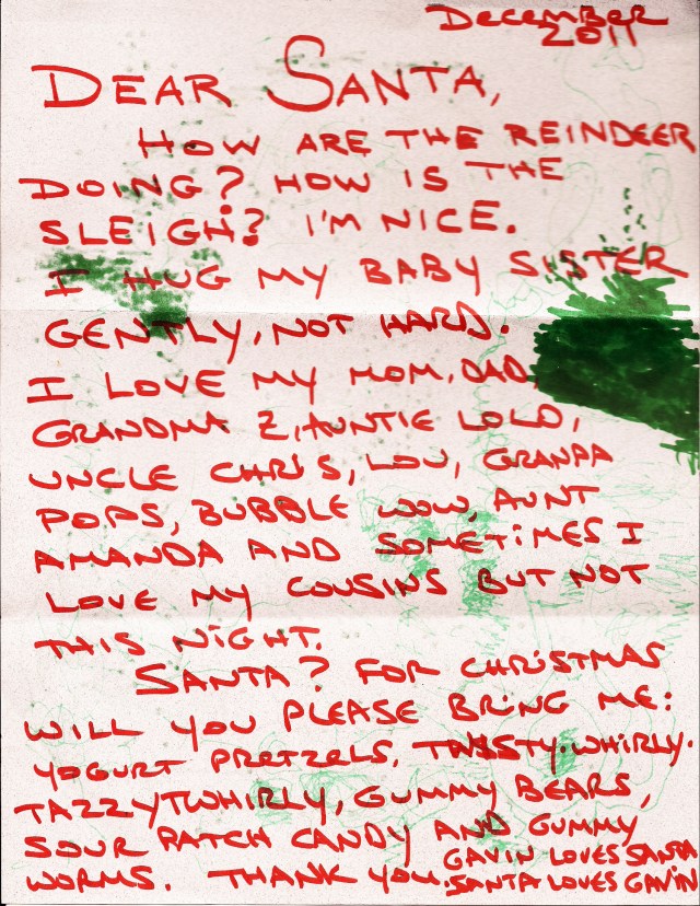This entry was posted in childhood, faith, love and tagged Christmas, Dear Santa, Gavin, letter to Santa, Twisty Twirly Tazzy Whirly. Bookmark the permalink.