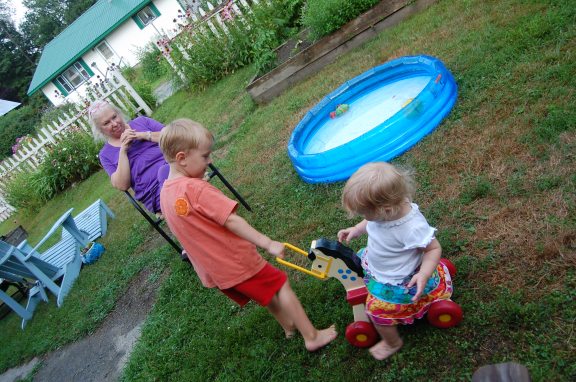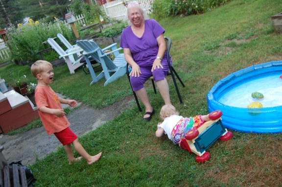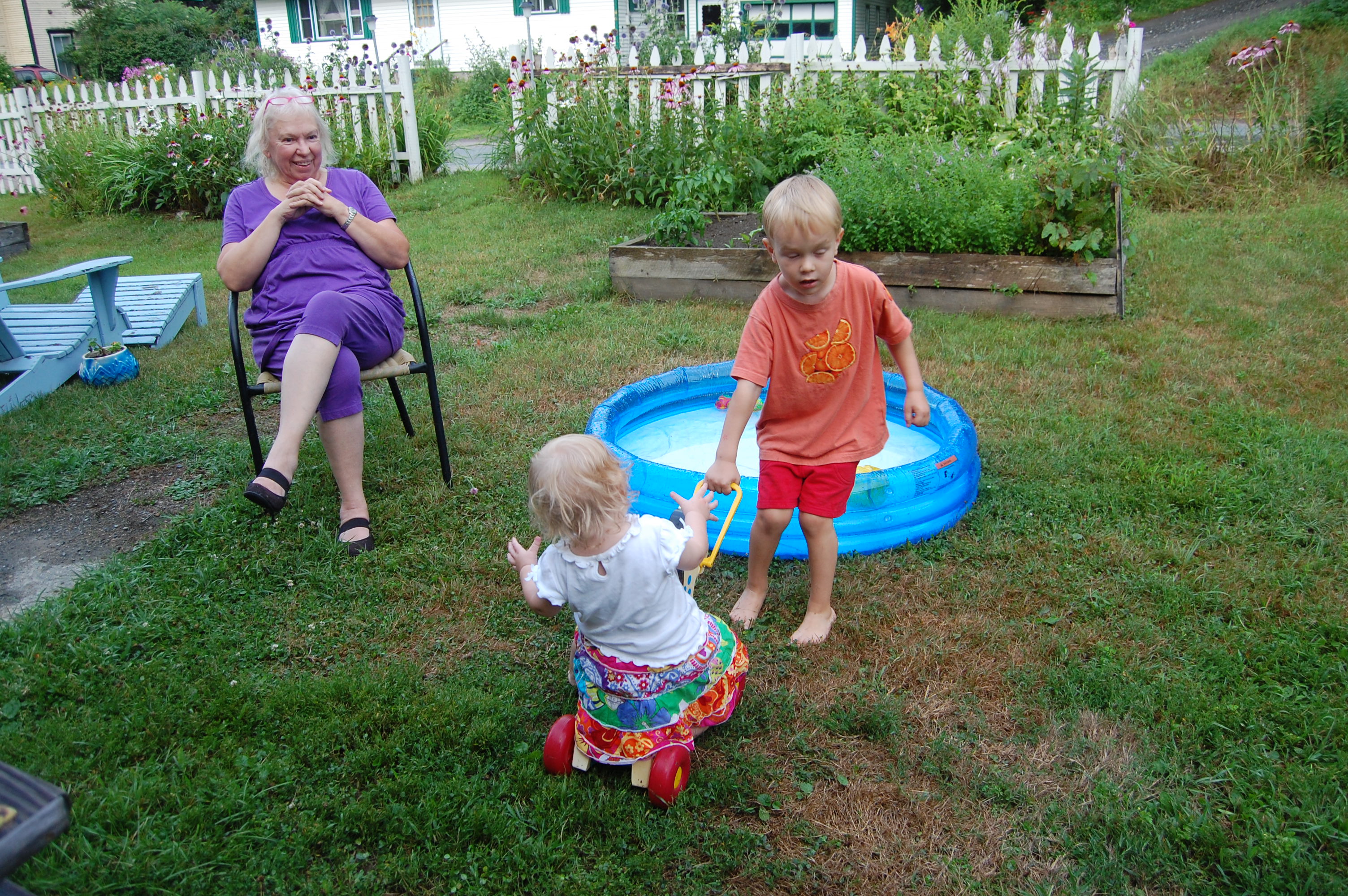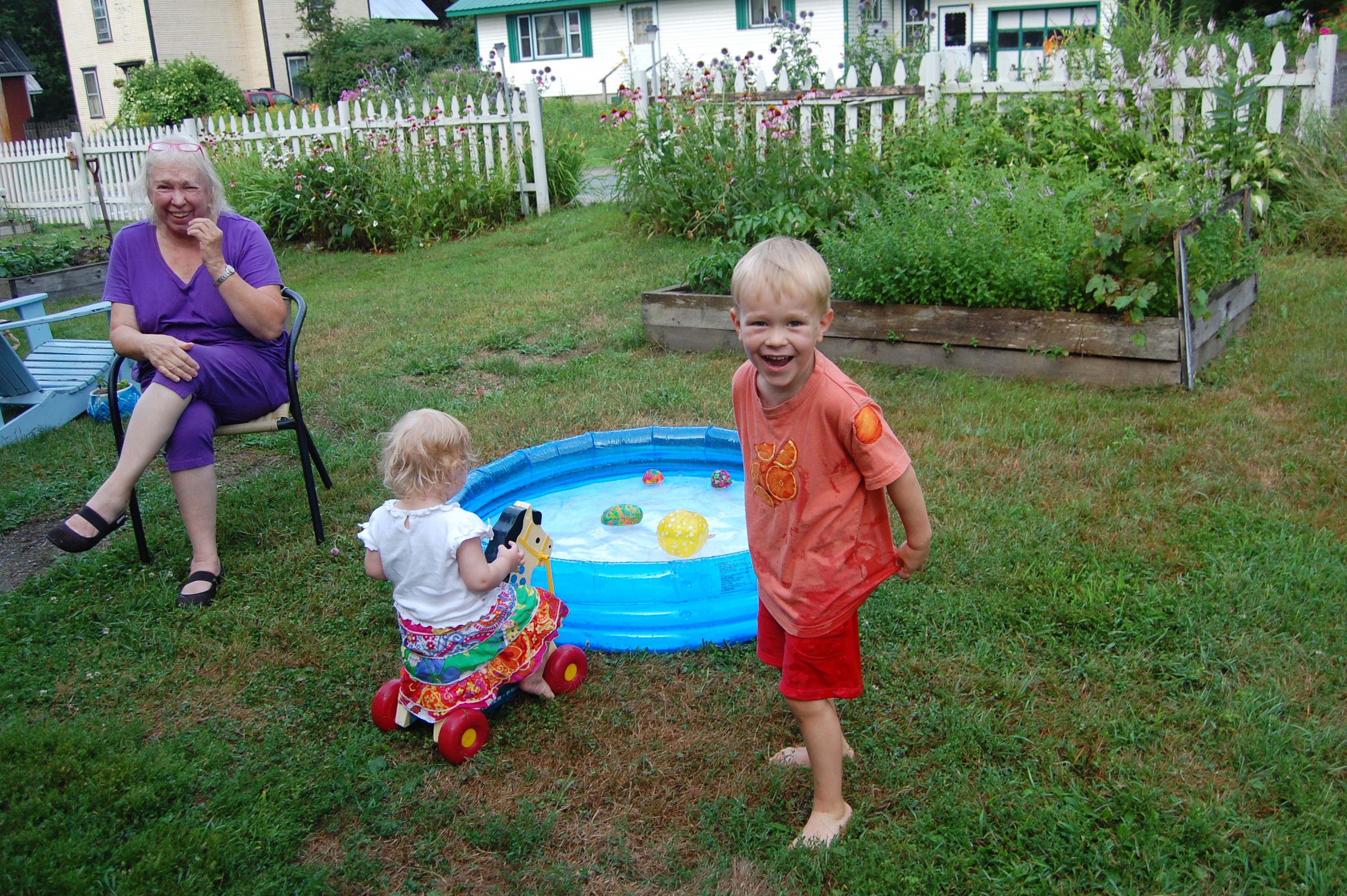 Over the weekend, we (“O’s) drove up to visit my mom in Vermont for the weekend, to help and purge decades worth of old photographs. As I helped my mom’s whole life flash before her eyes, what had for years seemed a daunting and insurmountable accumulation of memories, was by Sunday afternoon a mountain of boxes reduced to one modest shelf and one small heirloom suitcase (Hi Grandma & Grandpa Neely). My family was angelic through the whole process, and we were done early enough to celebrate with an early dinner at the summertime burgers & ice cream stand (Hi Onion Flats), followed by fun in the yard, or what my mom deemed “epic baby pool splashing.”