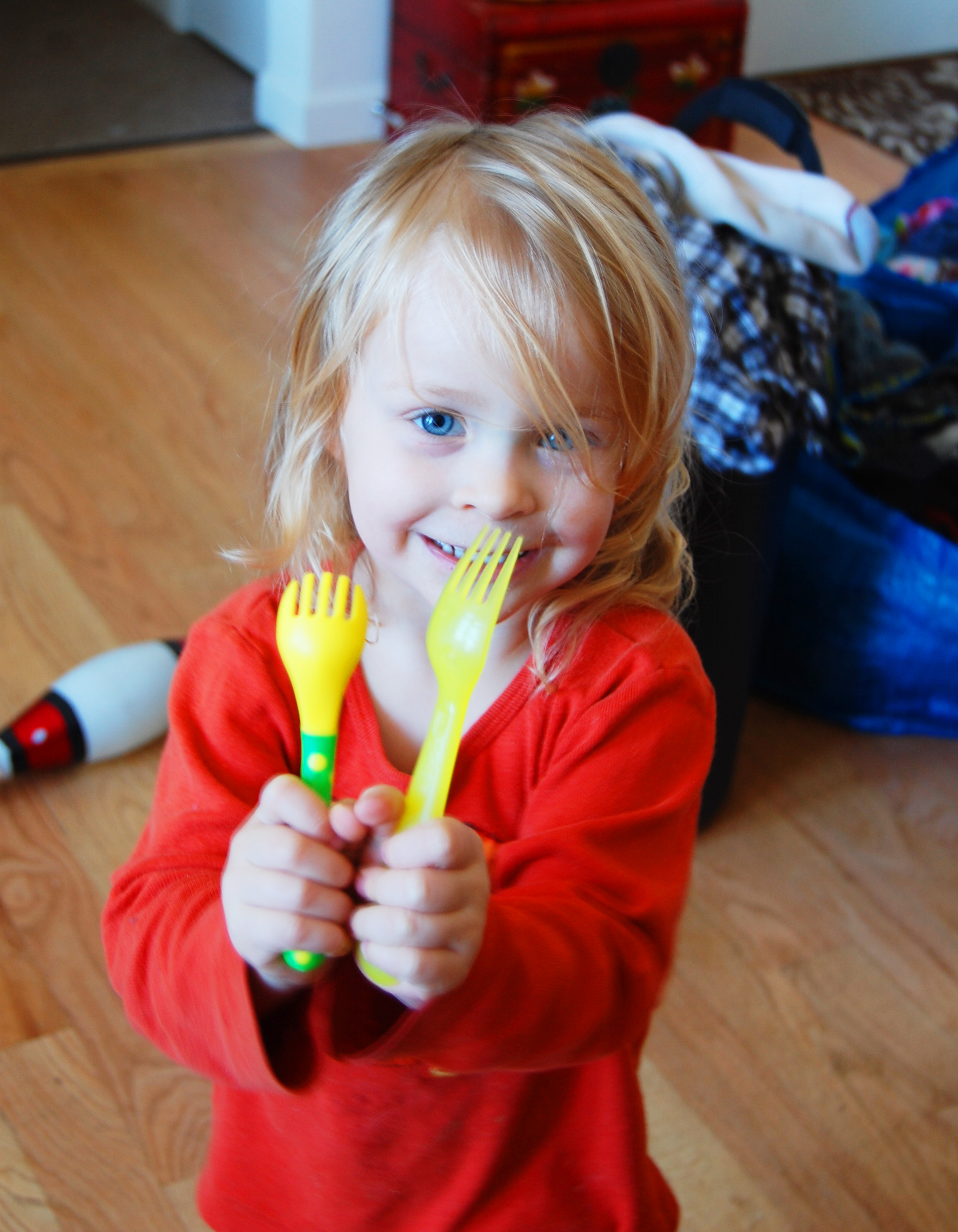 So I have pulled out Ye Olde Juggling Pins a few times in the last couple days (at home!), again with the encouragement of my amazing DH (“Dear Husband”). Of course my daughter -who is but two- insisted on trying them herself. When I saw her holding three juggling clubs -the tools of MY trade- I ran for the camera. When I asked her if I could take her photo holding the clubs, she said, “No, forts!” By which she means, “Forks.” The tools of HER trade of course. (Eating.)