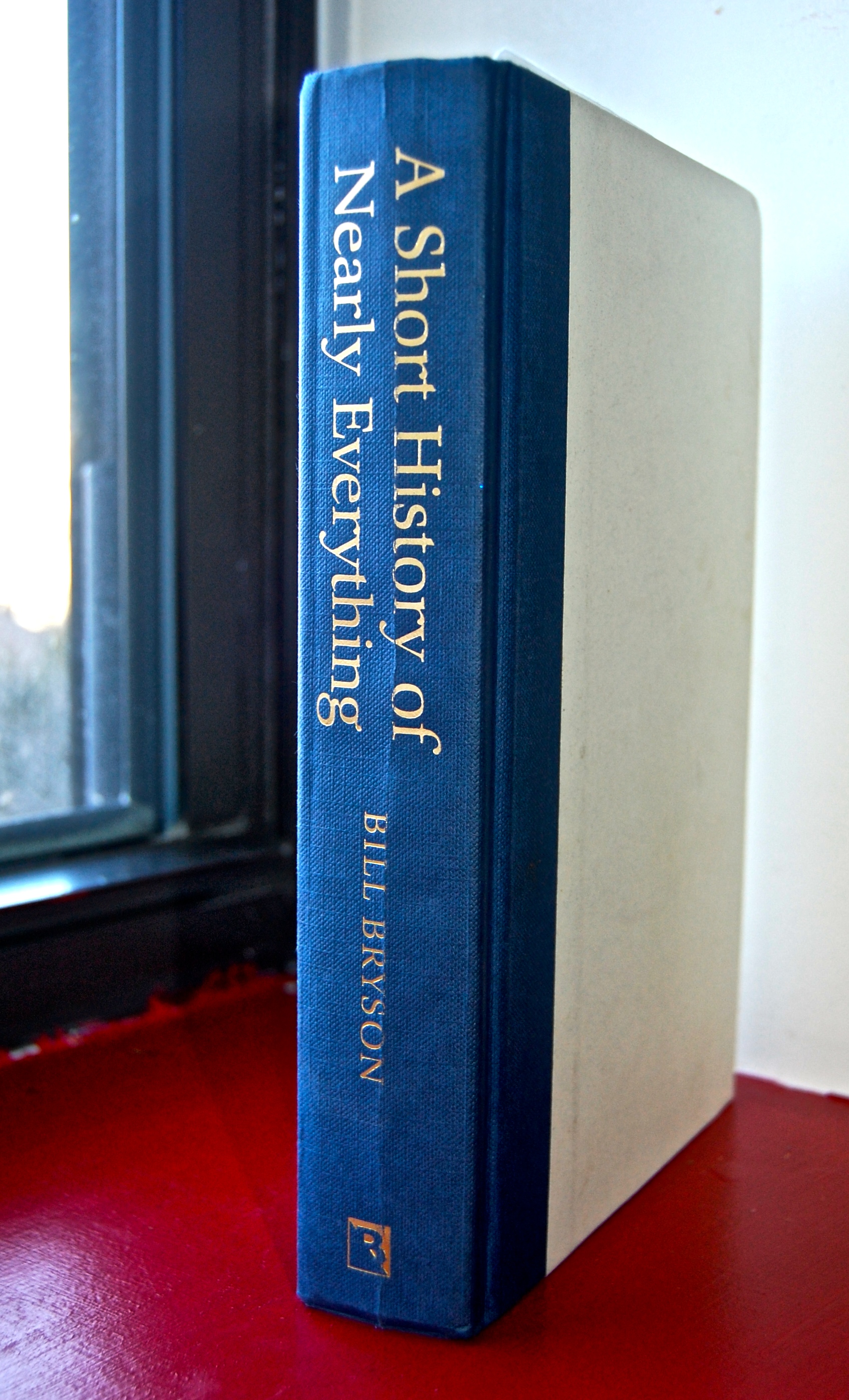 In his hand was “A Short History of Nearly Everything” by that energetic explainer/reporter/historian/travel writer out of Iowa, Bill Bryson, in which Bryson, indeed, takes a crack at describing nearly everything scientific in plain English. And Bryson’s writing style is quite direct and down-to-earth. I’m sure Gavin could follow the prose read aloud and probably find much of it fascinating.