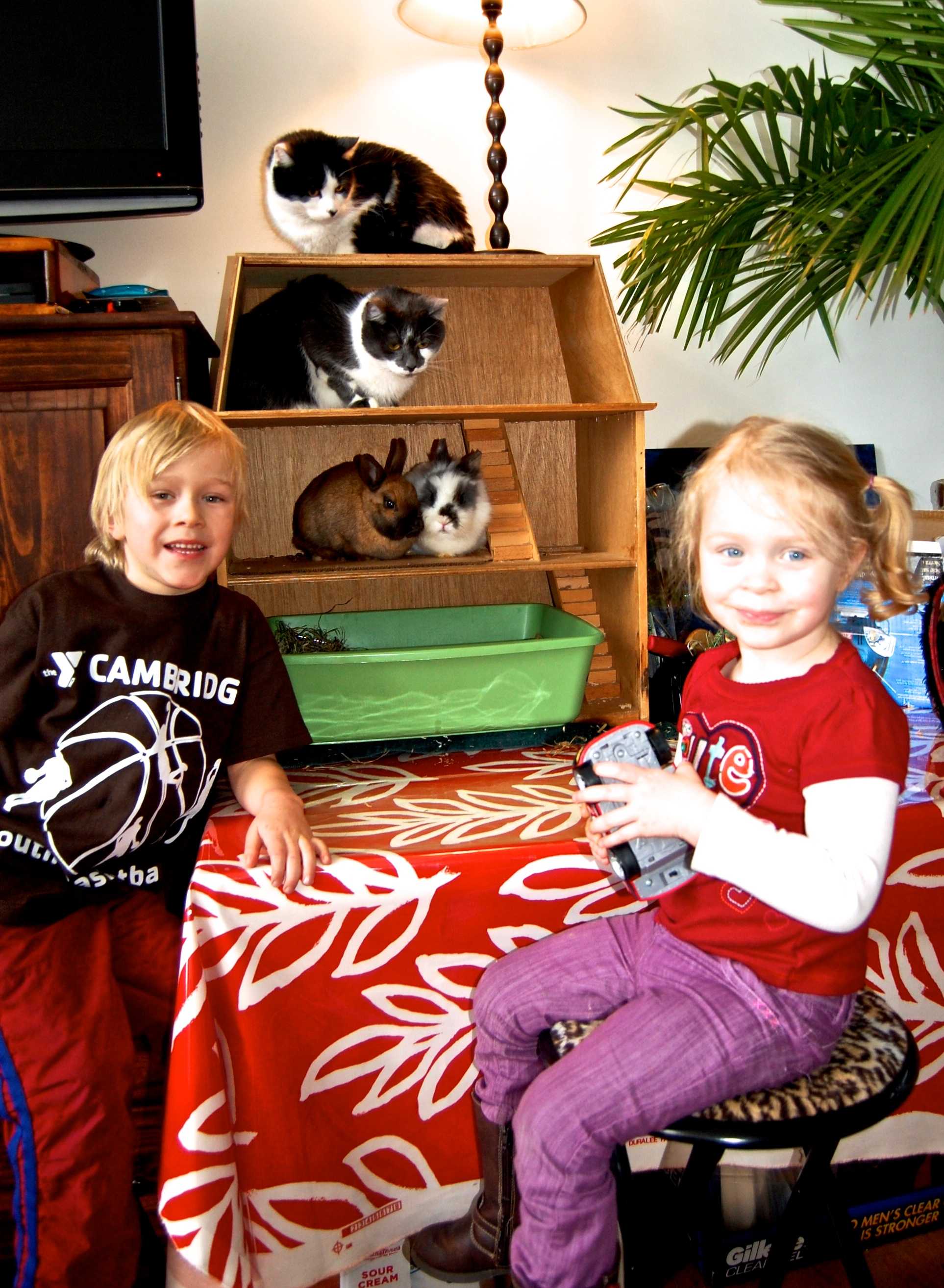 Loved this post! Clara Jane’s expression in the first picture is *priceless*. Rabbits are notoriously difficult to “sex”- especially when they are young (before the male parts drop). I’d double check them both myself if I were you to make sure you don’t have a breeding pair by accident. I raised rabbits for a few years and I was right about 70% of the time… so, yeah! Good luck! But baby bunnies are SO CUTE, and birth (and death and ALL that) are so great to expose kids to. Great names! So cute that the cats are cool with them! Yay bunnies!!! 😀