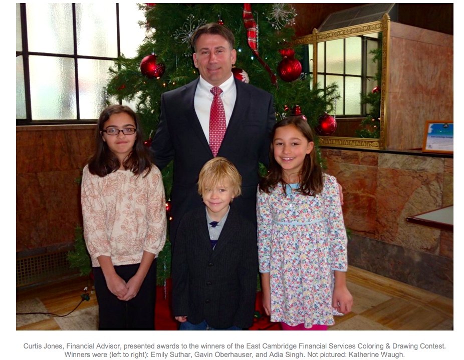 Earlier this winter, our local bank (East Cambridge Savings) also had an art contest. There were four age categories with different drawings to color for each (including a *blank* page for the oldest category). I grabbed entry forms for all the kids we had over for Thanksgiving, provided it to them as an activity and submitted their entries the following Monday. Gavin’s was a scarecrow that he colored in. And guess what; he won his age category! The reward was posing for this photo at the bank with other winners, and $125 dollars!