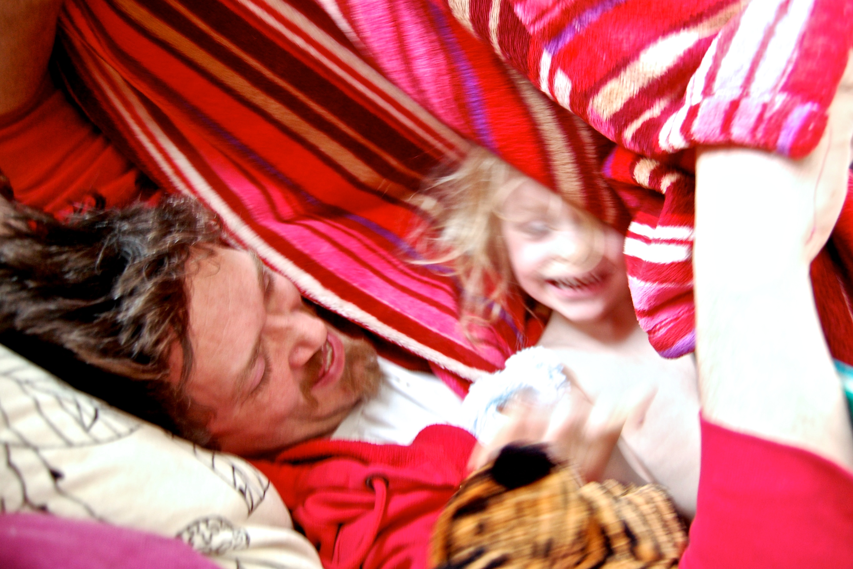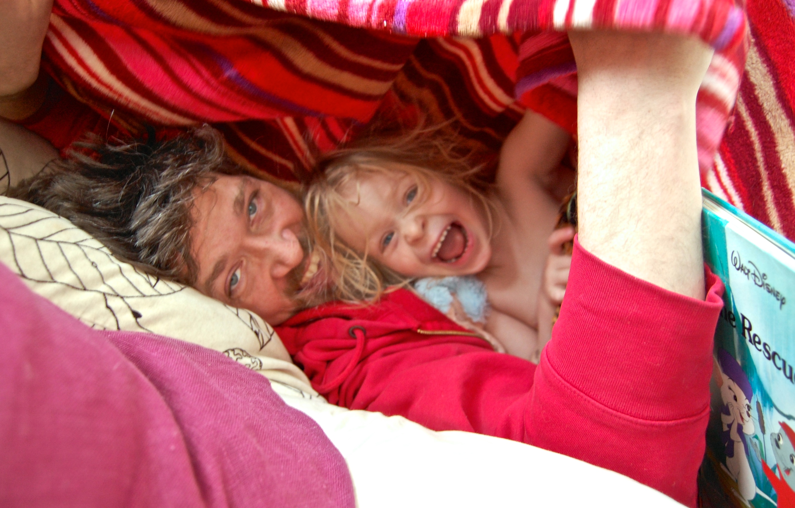 Wiped from weekend gigs (and one night out with friends, amazingly)… working from bed next to my baby girl and her daddy playing under the covers, like ALL morning. #Heaven — with Paul Oberhauser.