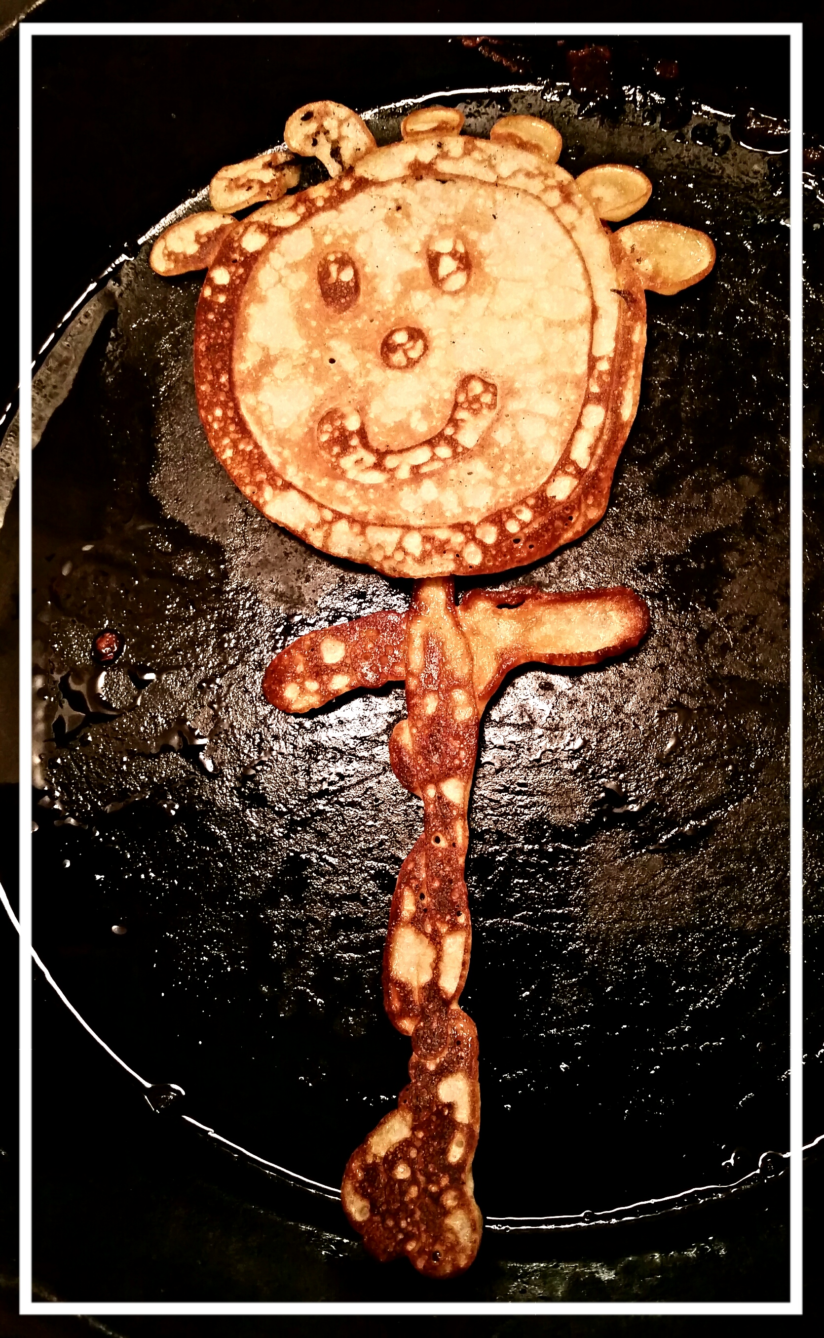 This morning upon waking, Boy is grumpy, but wisely angling for PANCAKES.  Daddy gives him enough directives to perform some perfunctory mise en place.  During this time, Girl conducts me through getting her dressed into proper Princess regalia.  Actually, “Mom can you help me get out of my soaky diaper and put on my Cinderella shoes?”  was the precise directive.  Then she asks me to read her Terrible Lizard. “It’s a magazine,” she explains.  (Comic book, but whatever.)  By this time Daddy has undertaken to introduce PANCAKE ART to the morning operation.  (BEFORE coffee even; living dangerously.)  It was my turn to make a pancake, so while I was to be reading to my daughter, instead I make her: