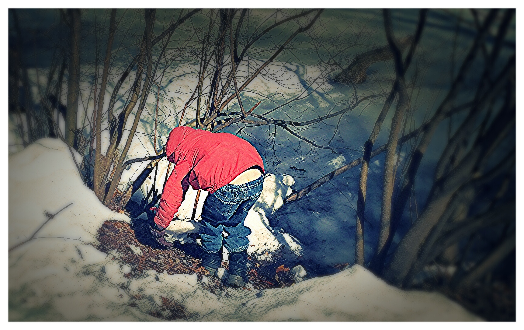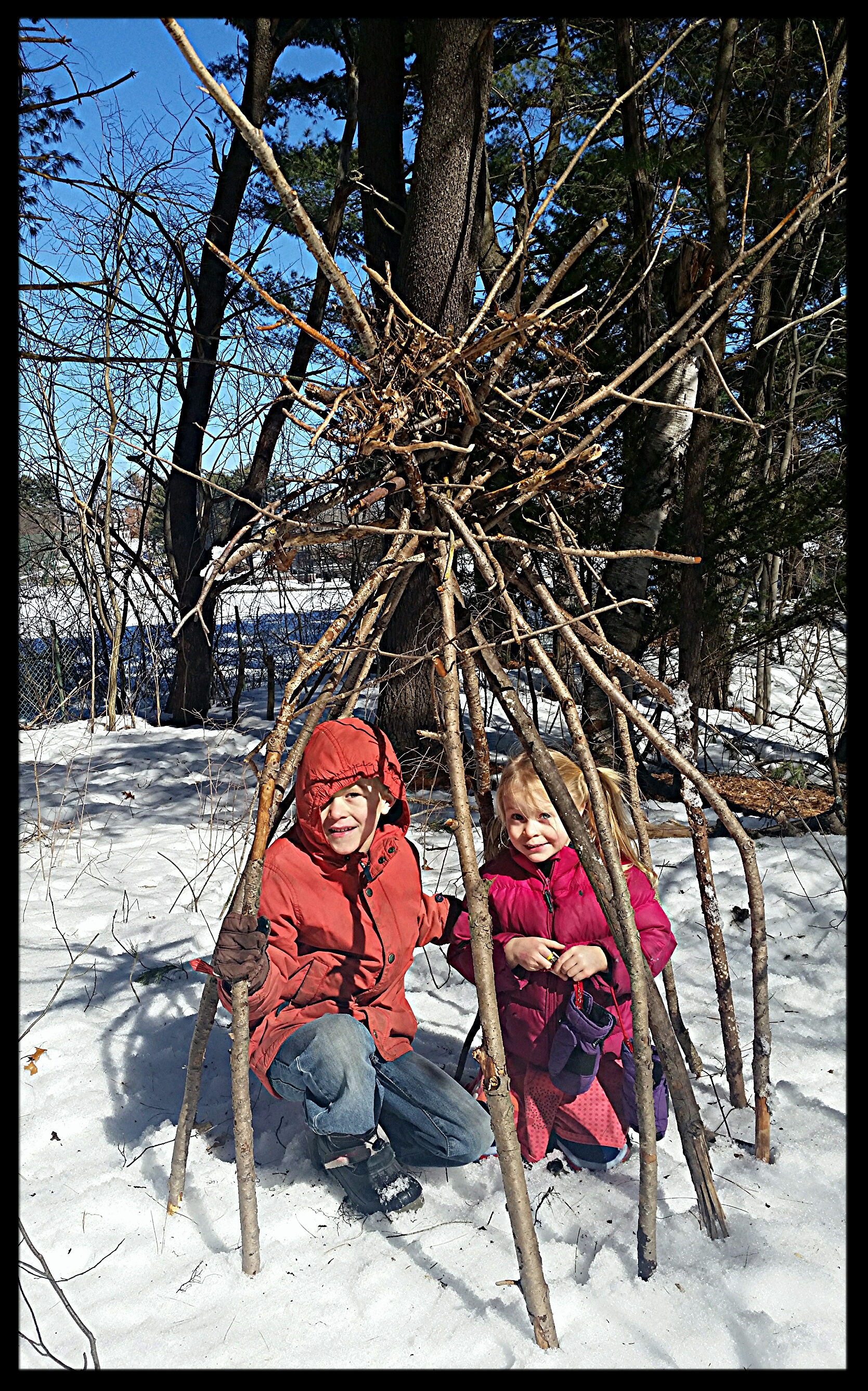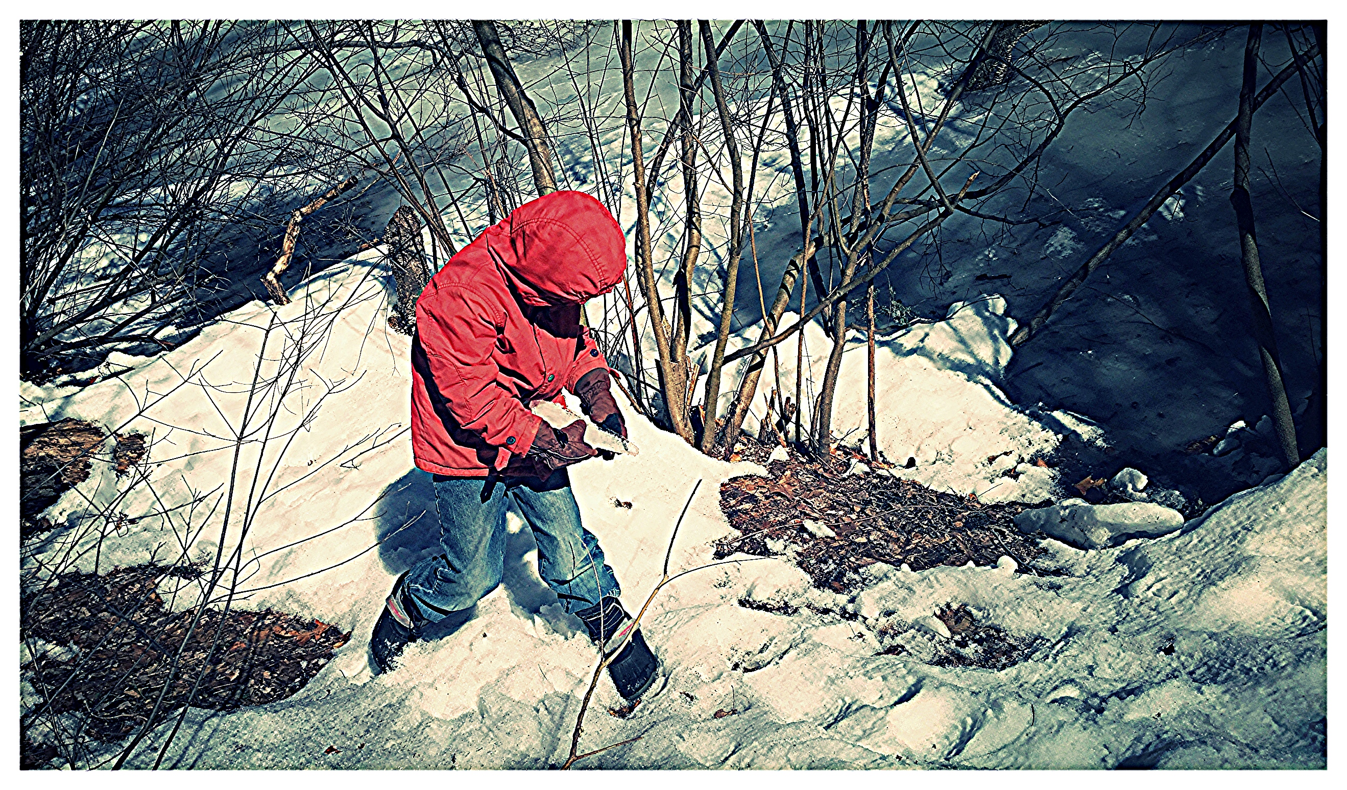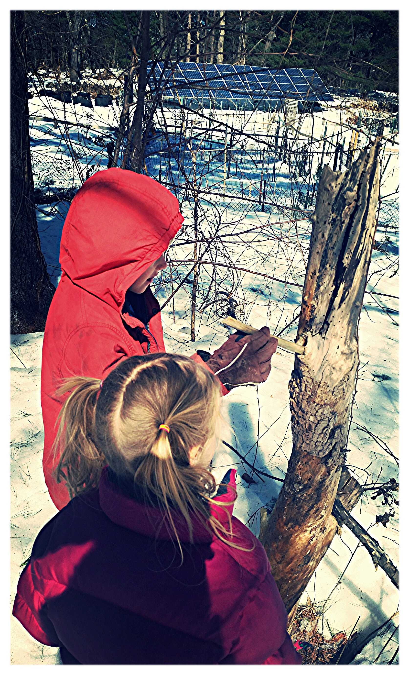 The kids immediately make a game of finding and pondering *holes* (in trees, in the snow, in the ground). Naturally some need to be poked with a stick.