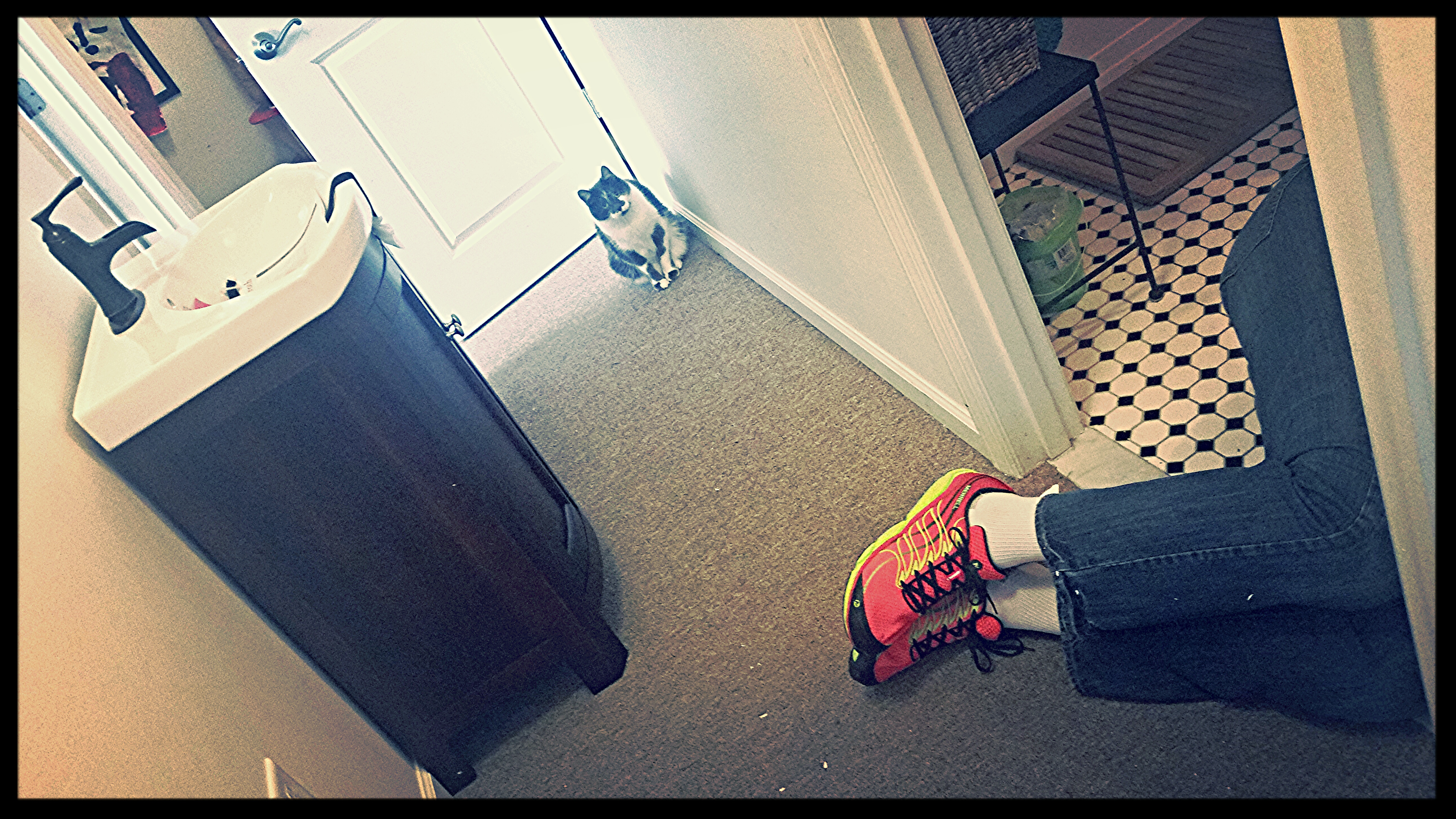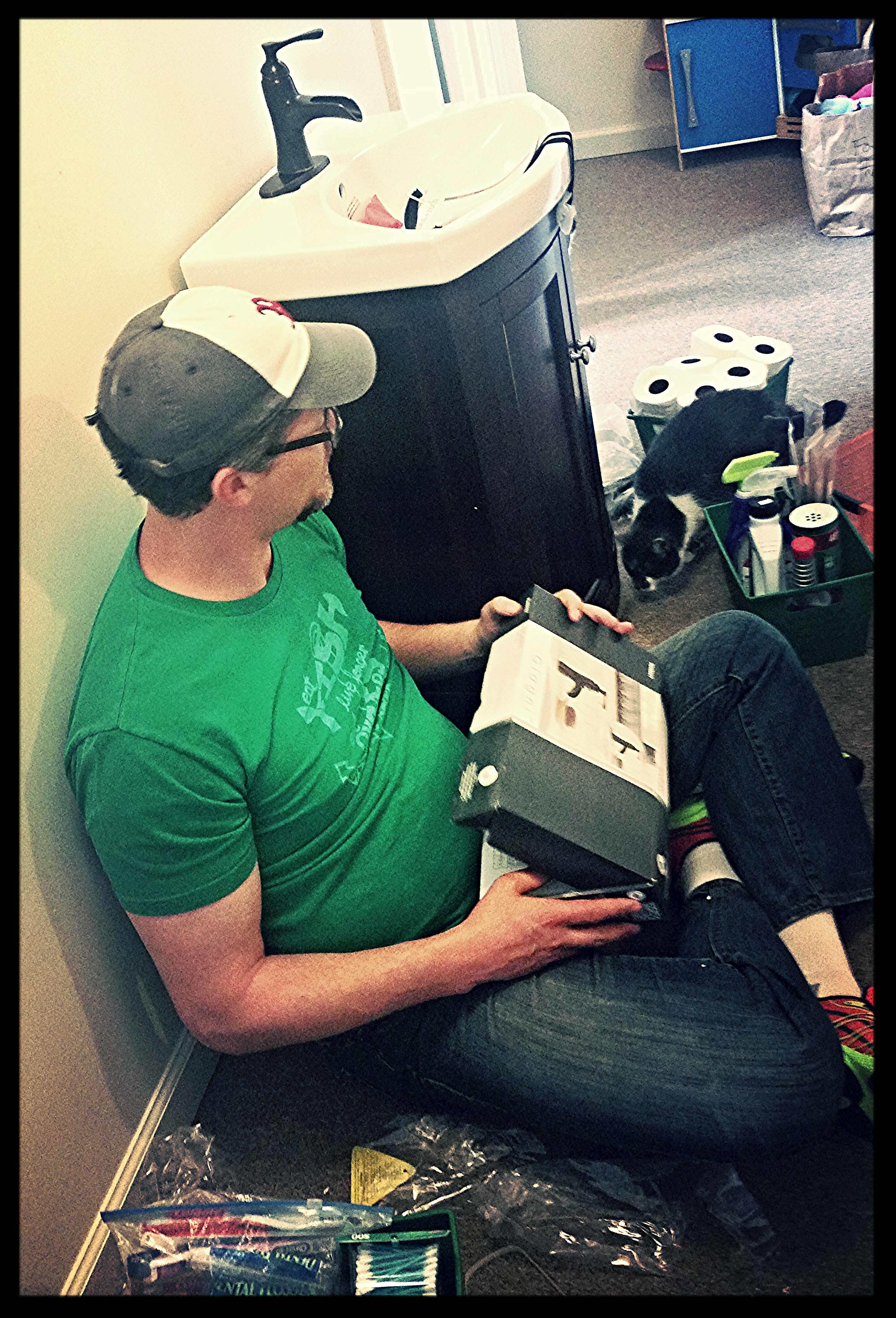 So far so good, by the way. He unhooked our old sink cabinet without disaster The rest is still in process. (Turns out the new one has a fru-fru shelf-drawer thing inside blocking the space for the pipes wouldn’t you know, so today we’re working on removing it… well, *DH* is, since I have to go to work.)