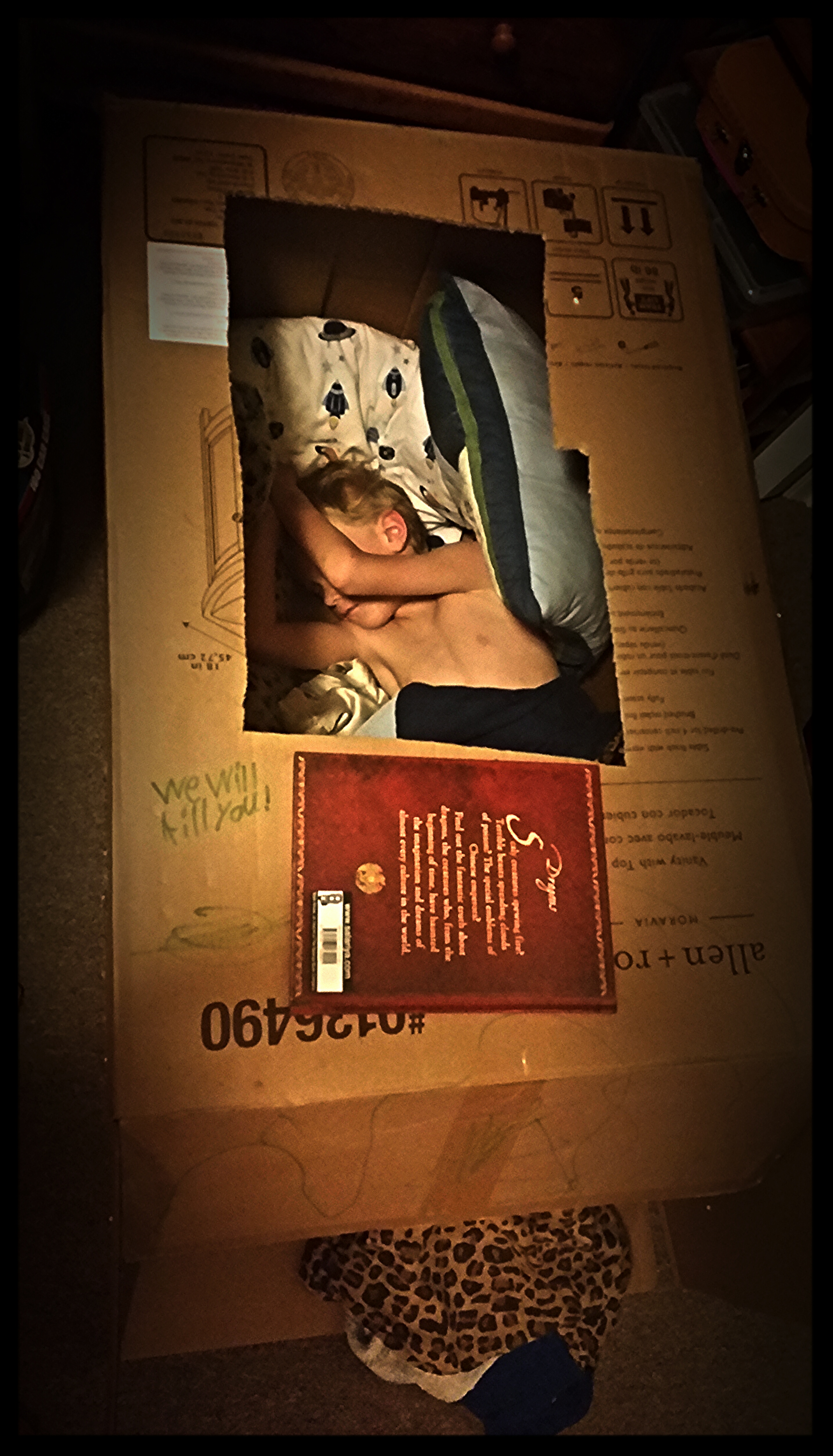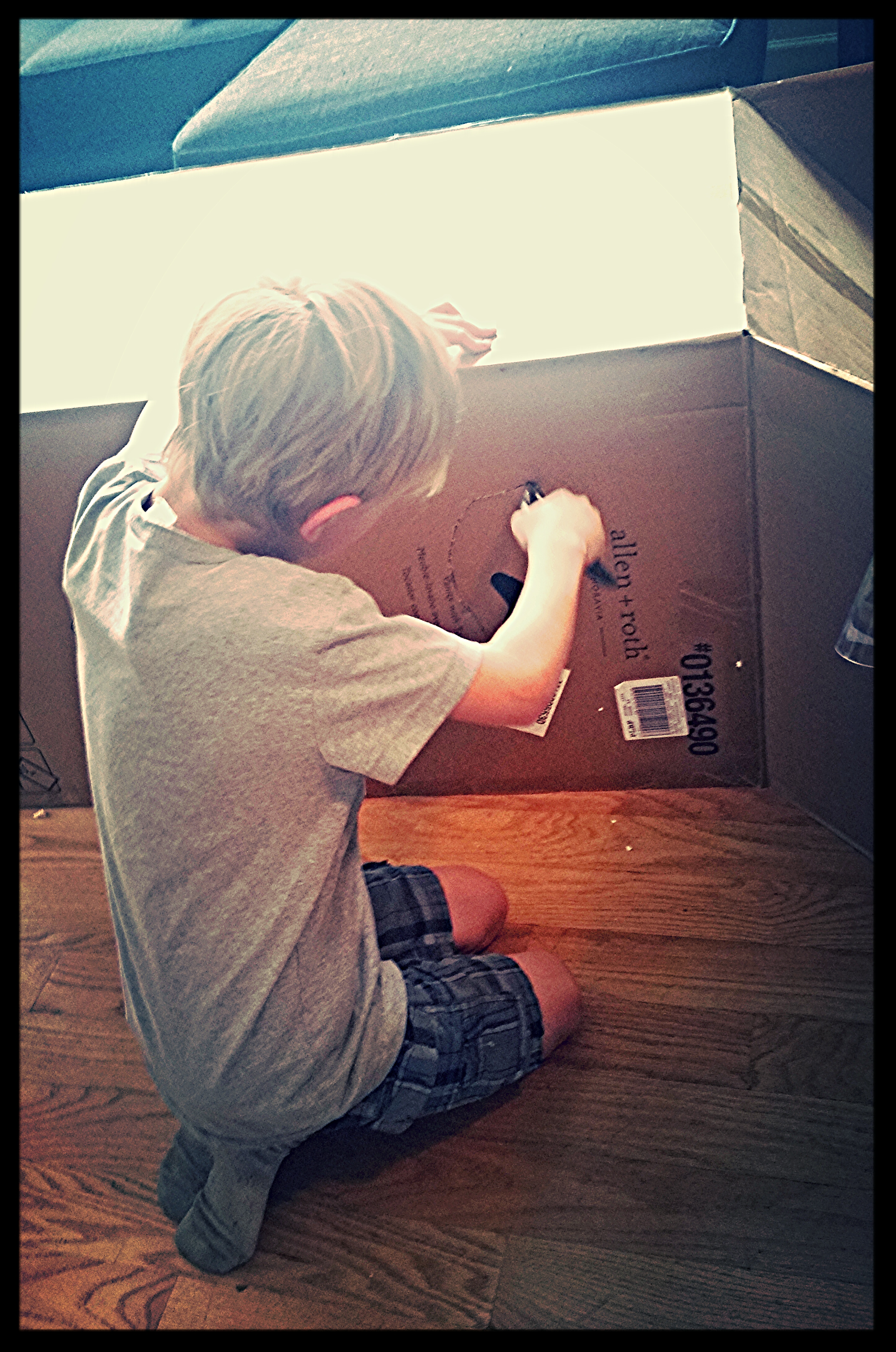 Gavin set about to cutting his windows and access holes IMMEDIATELY upon coming home. Besides, how many opportunities do you get use a hand saw when you’re a kid?