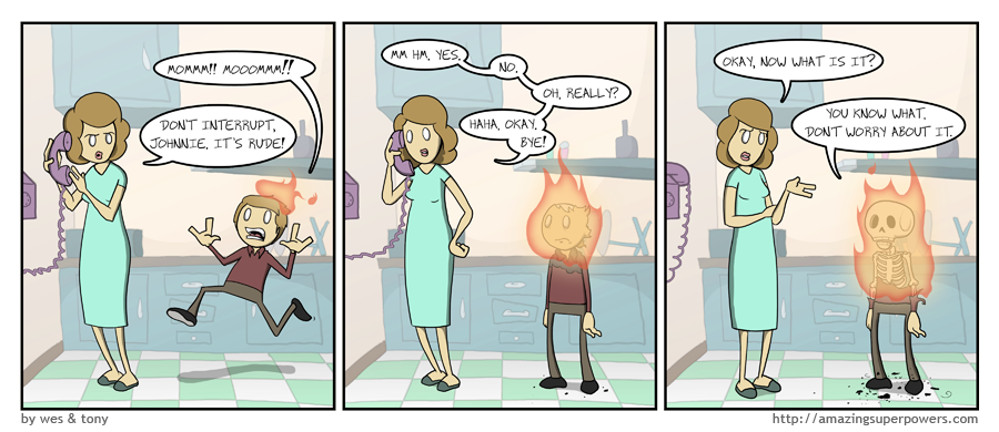 Me: Good! The only time I want you interrupting me on the phone is if you’re on FIRE, or have been partially eaten by a BEAR. Got it?