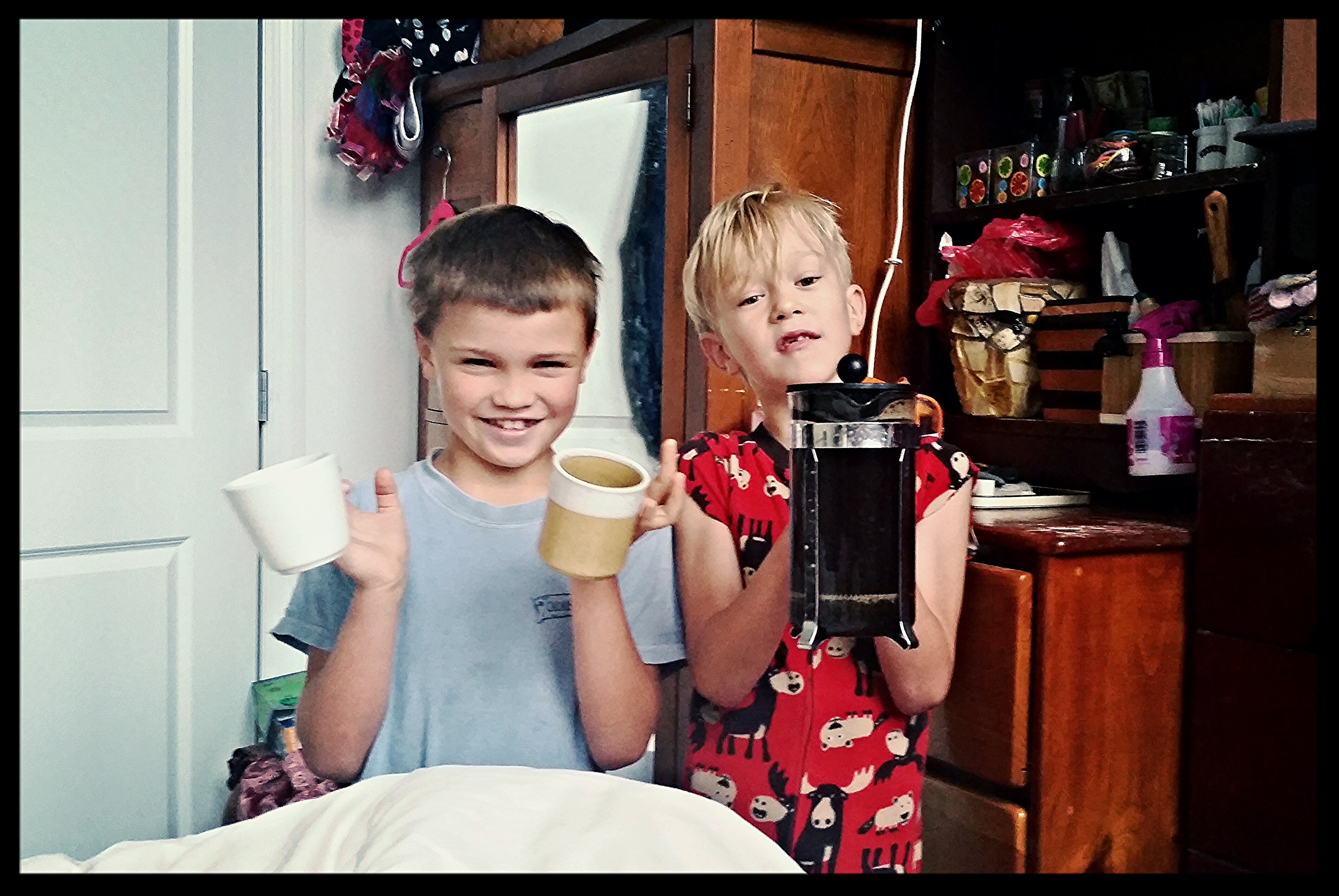 By Saturday we waste no time pressing him into the service of Coffee Duty: