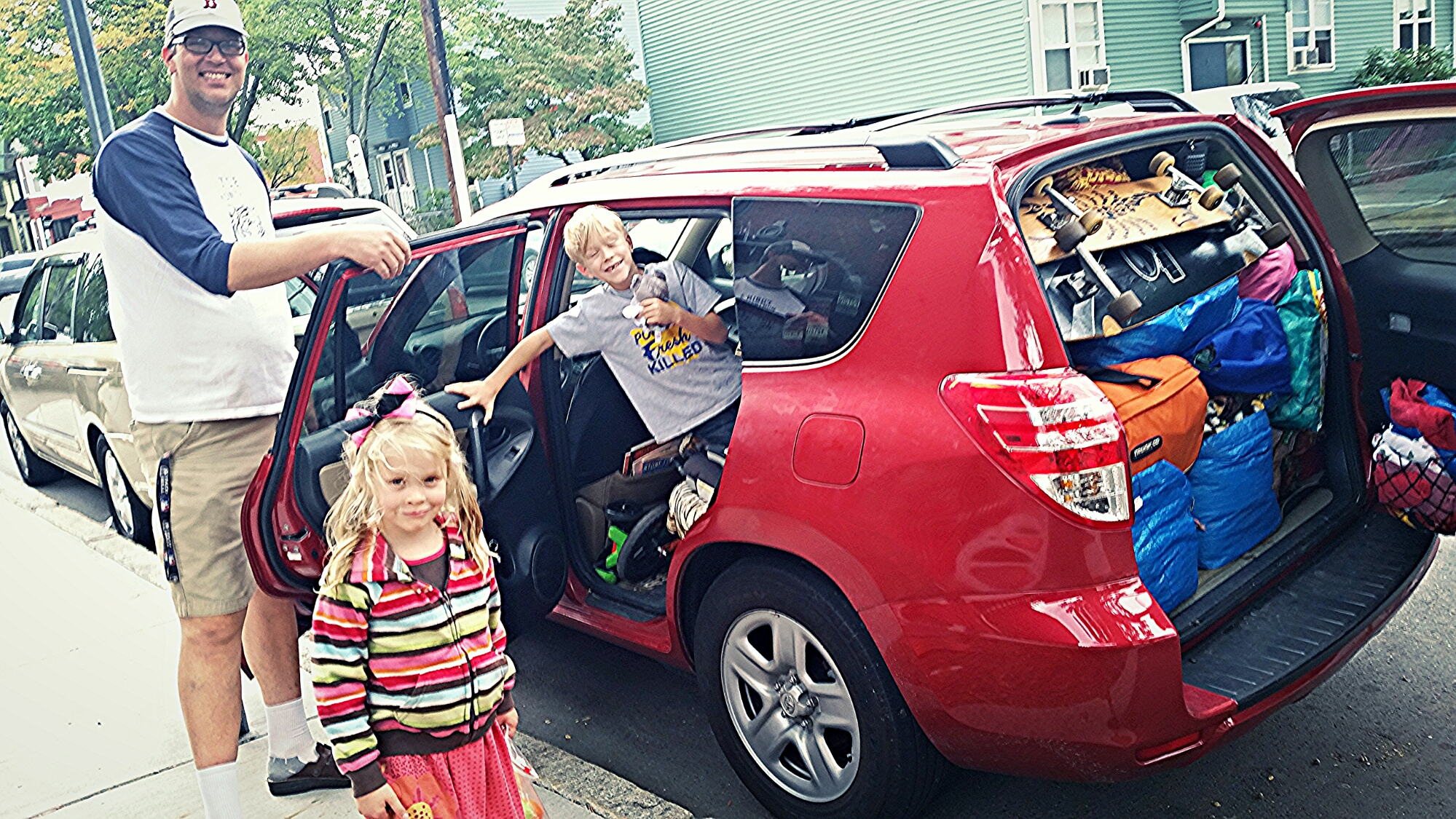 Actually there are already bikes, scooters and skate boards in the car, plus camp chairs, hammock, fire torches and booze. Paul steps up to survey:
