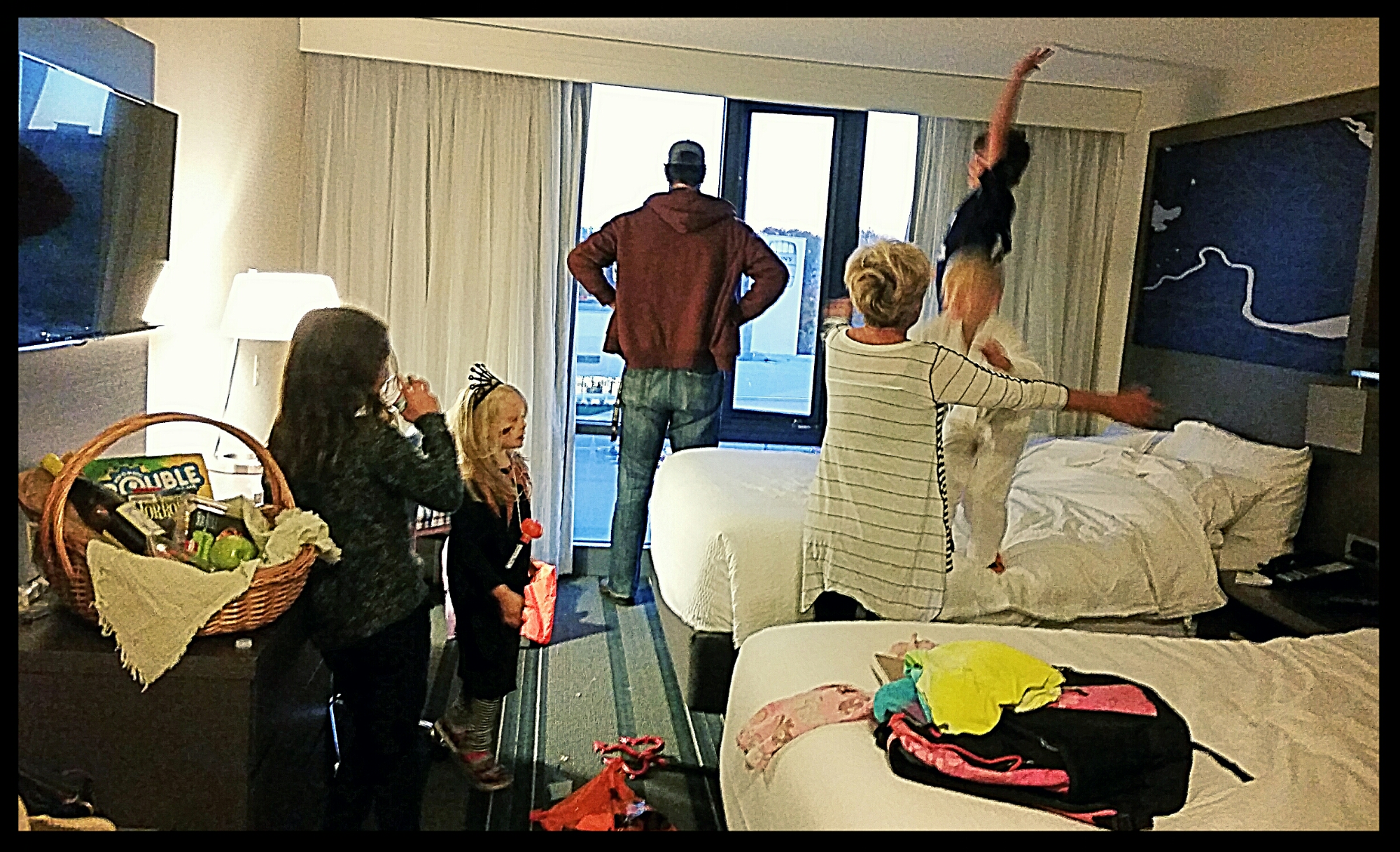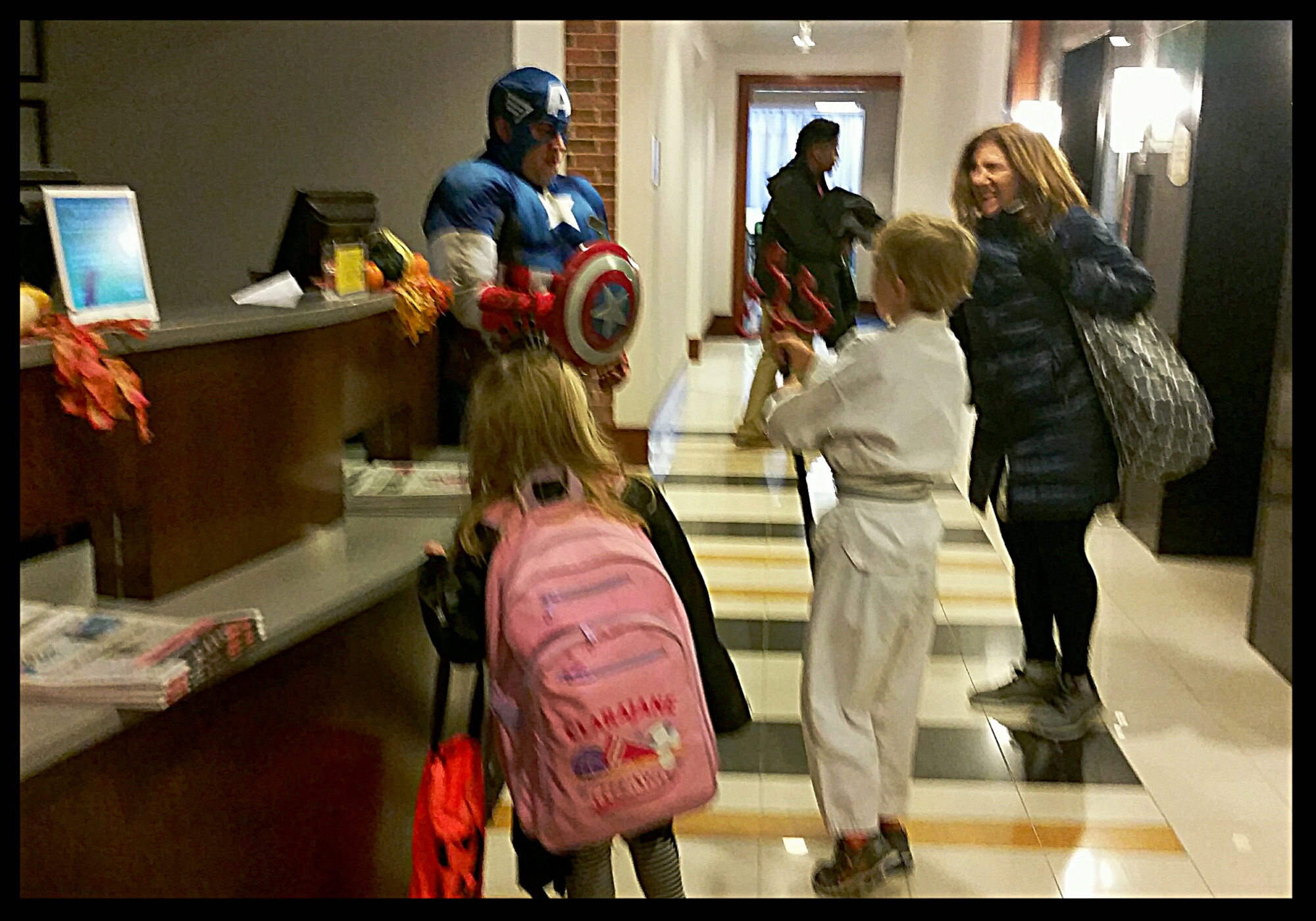 Moving right along, we’re off to the Marriot Hotel by the River. First a quick joust with Captain America, who told ClaraJane “You’re too strong for me.”