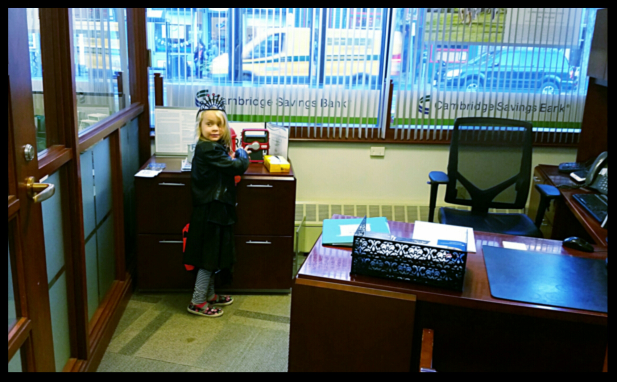 The bank on the other hand was not expecting us to come in Trick-or-Treating, so ClaraJane sneaked into the bank manager’s office -like she always does- to sneak some doggie treats from the secret stash.