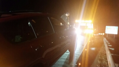 This guy was all business. He talked to me long enough to tell me a tow was coming, and seemingly to ascertain that I’m not a psychopath, just an idiot in a clown hat. He spent more time inspecting the front of his grill with his flashlight.