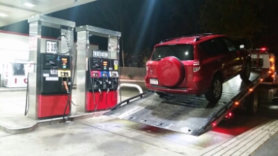 A quick ride in the fantastically high P.O.V. of the truck’s cab and the driver’s workaday world, my car is deftly dropped at a gas pump, he says, “Can’t get better than’at,” $100 and we’re done.