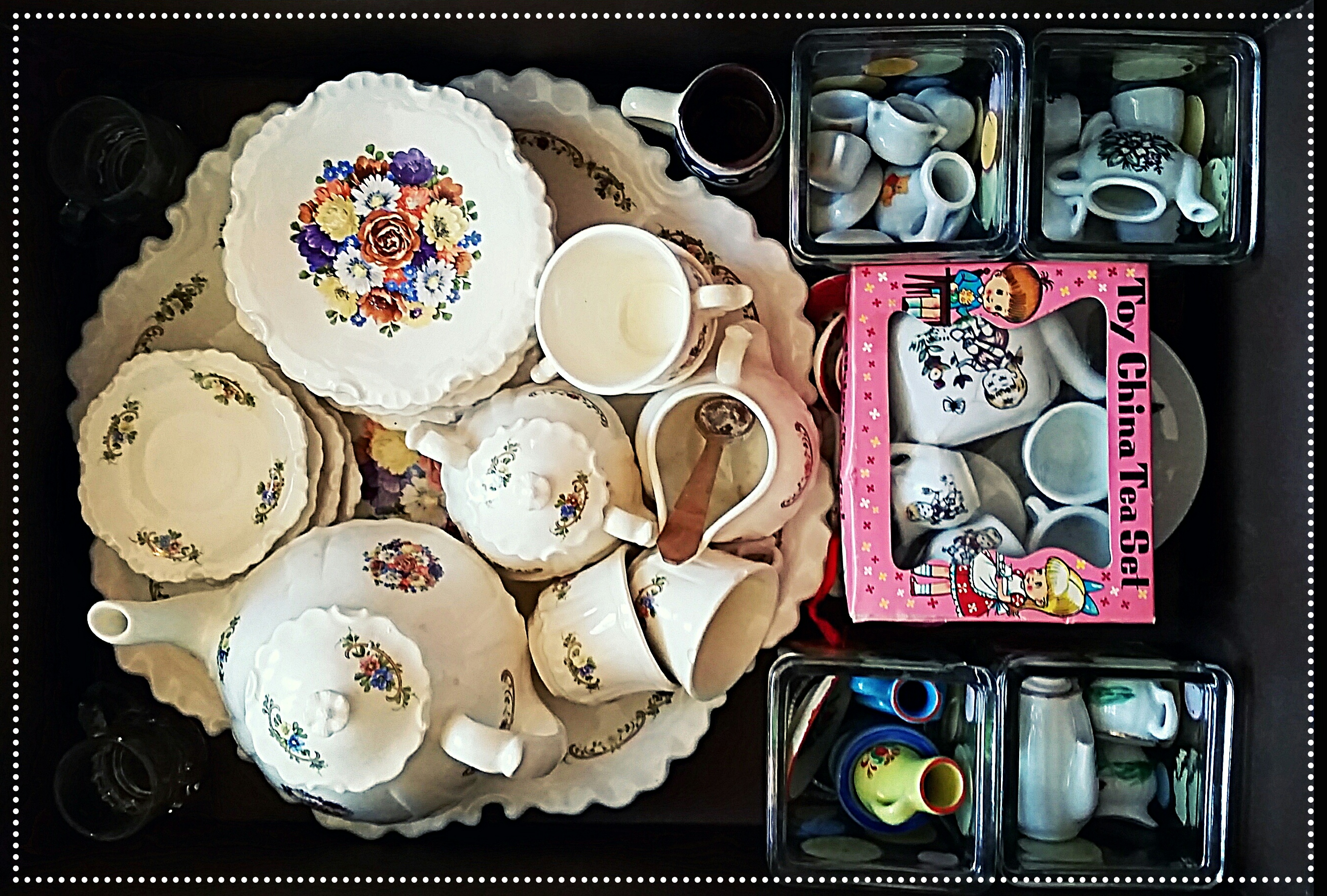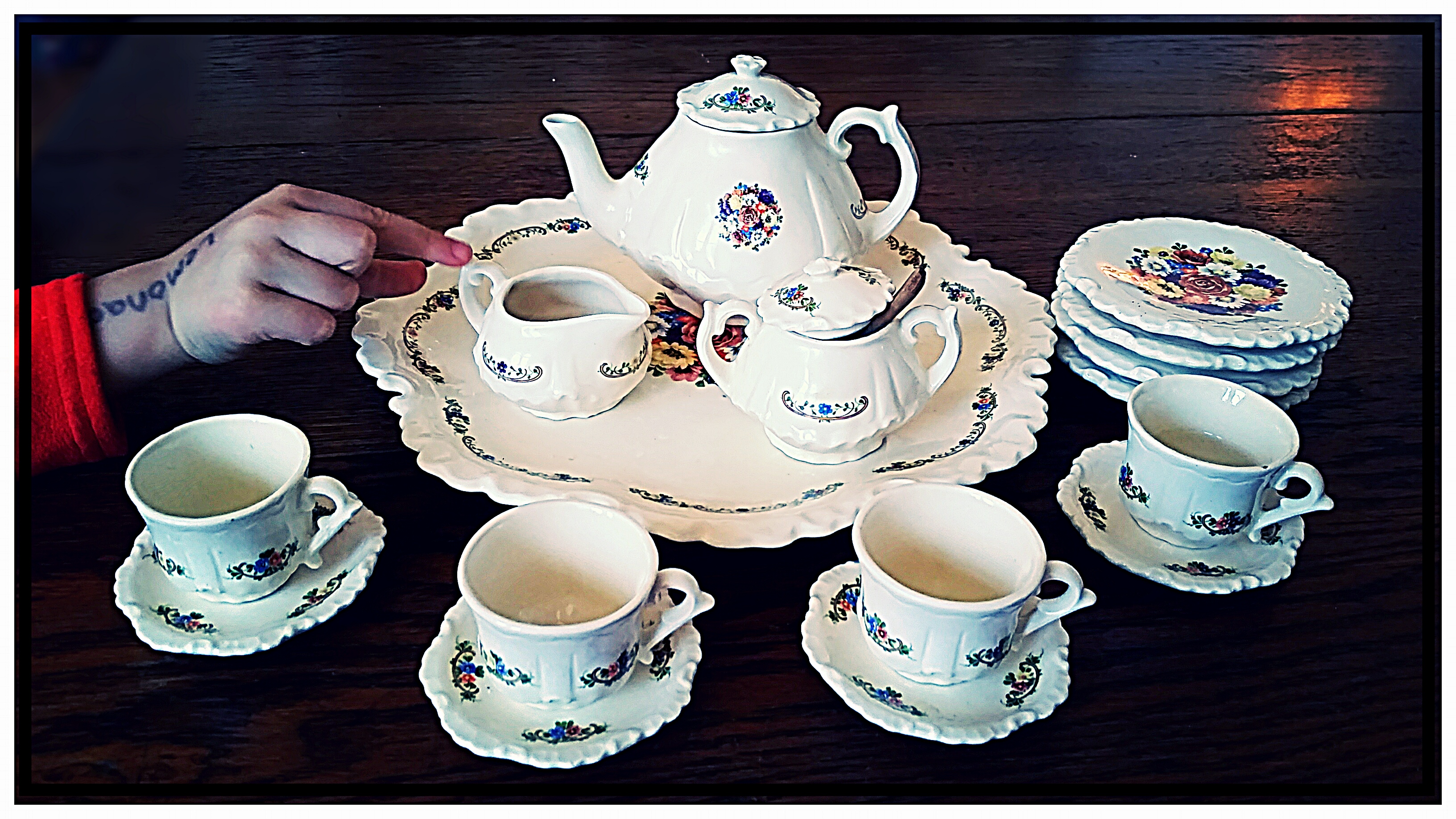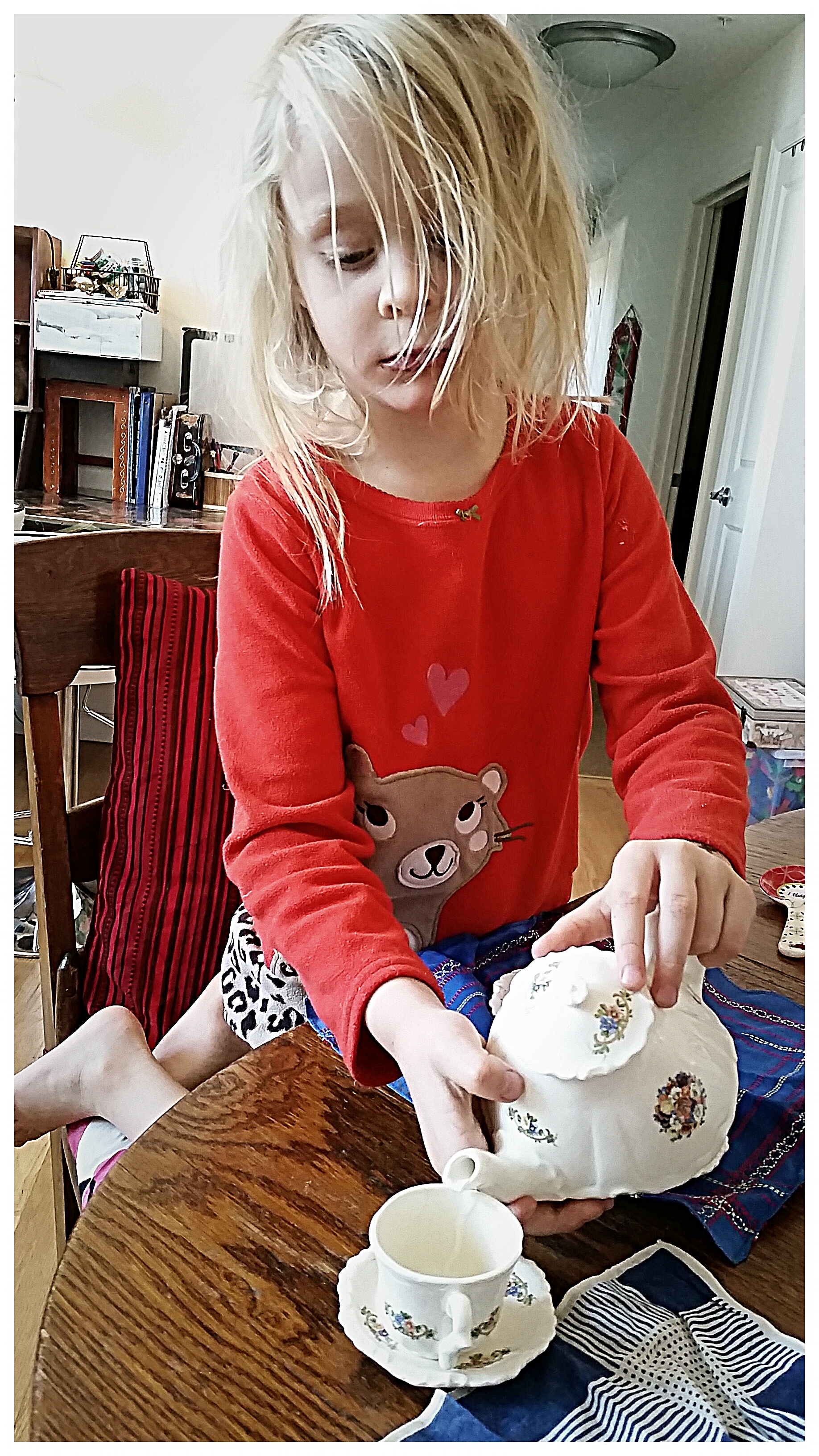 As I play tea with my daughter this day, we are using the set made for me as a child by my Grandma Maryan.  My stepmom’s mom in fact; a most industrious and multi-talented woman in her day.  It’s gratifying to discover all the pieces still together and intact.