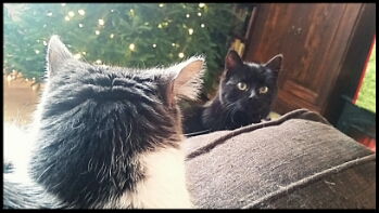 Poor Flash Cat  –so dumb but nice–  tries to figure out what he thinks of the new arrival.  He tries to have opinions, but I’m afraid it’ll never happen.