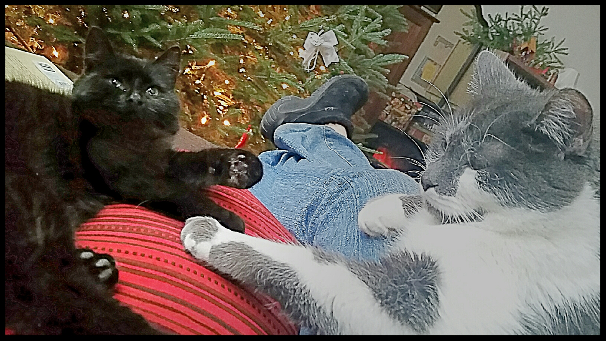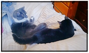 In fact much of the time I’ve been composing this morning,  they’ve been sitting on me holding… paws.  Playing a slow game of “Mine is on top,” “No,  mine is on top,” “No, mine…” etc.