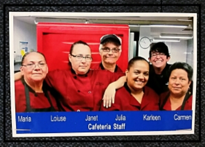 Because I had to put limits on how much a wife can annoy her husband on his first day on the job, I don’t yet have a shot of him with All the (Lunch) Ladies,   but here they are in the staff photo on the school bulletin board: