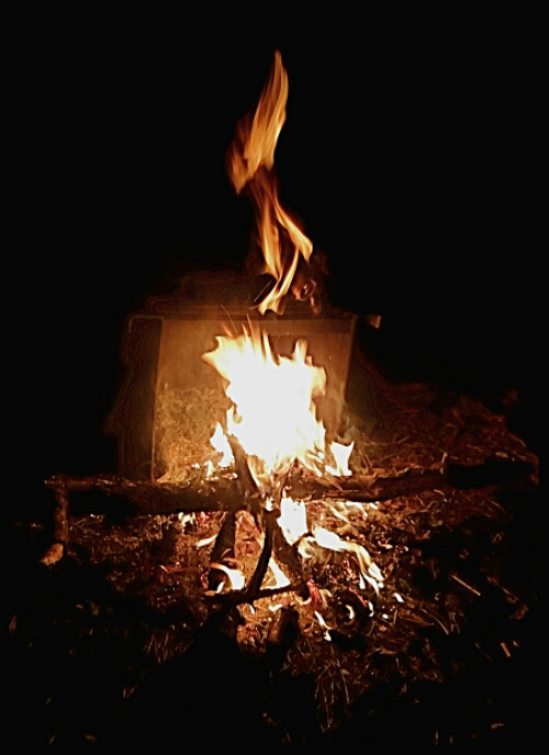 What are you burning in that fire? It looks like an old TV. Symbolically perfect!