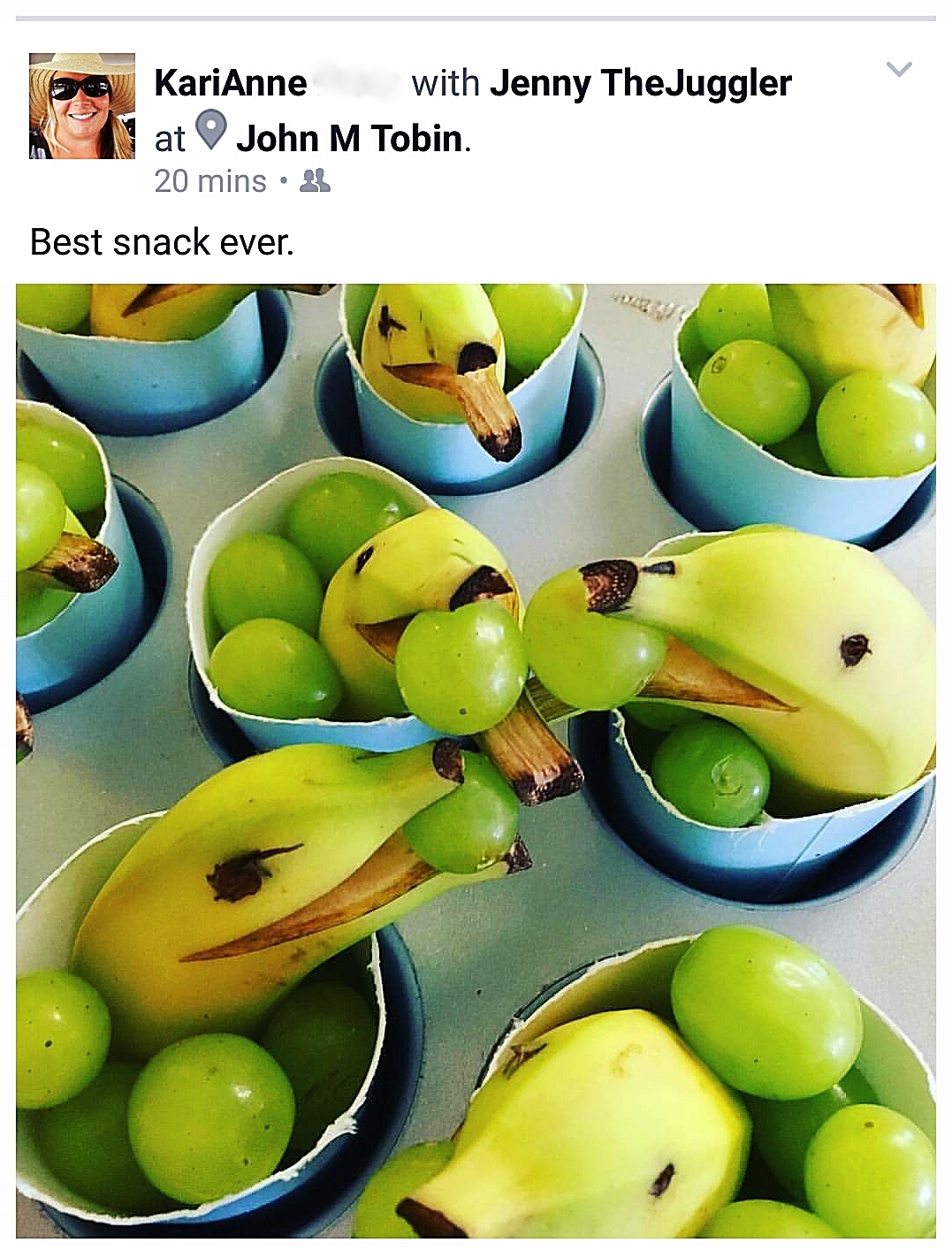 As you plainly see, the greatest virtue of this snack for school is that it is… GLUTEN FREE.  (No I don’t know what “gluten” is so don’t ask.  But I’m certain I didn’t add any to the grapes or bananas.)