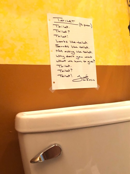 Toilet.  Toilet?  Toilet!  Looks like toilet.  Sounds like toilet.  Not acting like toilet.  Why don’t you want What we have to give you?  Toilet.  Toilet?  Toilet!