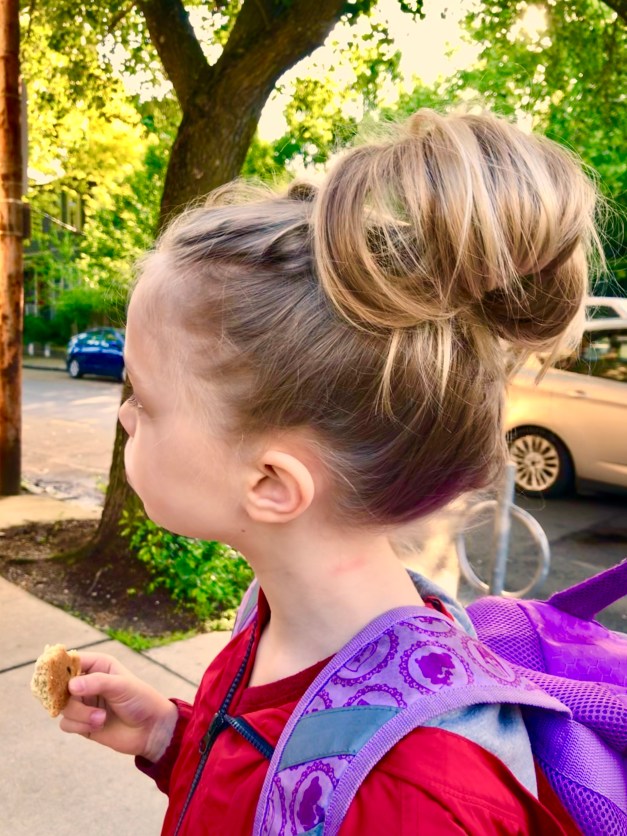 Daughter; waiting for the bus, eating a cookie, under a messy bun.
