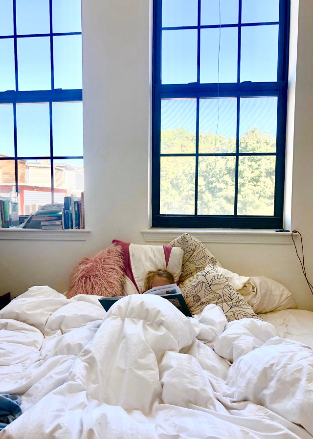 GIRL: [Gets under covers, snuggles in with a book.]