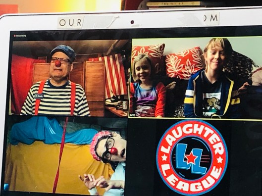 My hospital clowning team has been busy during this pandemic cultivating the ability to visit patients virtually. We of course need some test kids so look who stopped by our Homeschool!