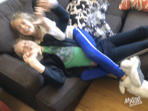 AT RISE: It is “recess” in the distance learning environment. The kids are wrestling on the couch and Little Sister seems to have eeked out a slight advantage over Big Brother.