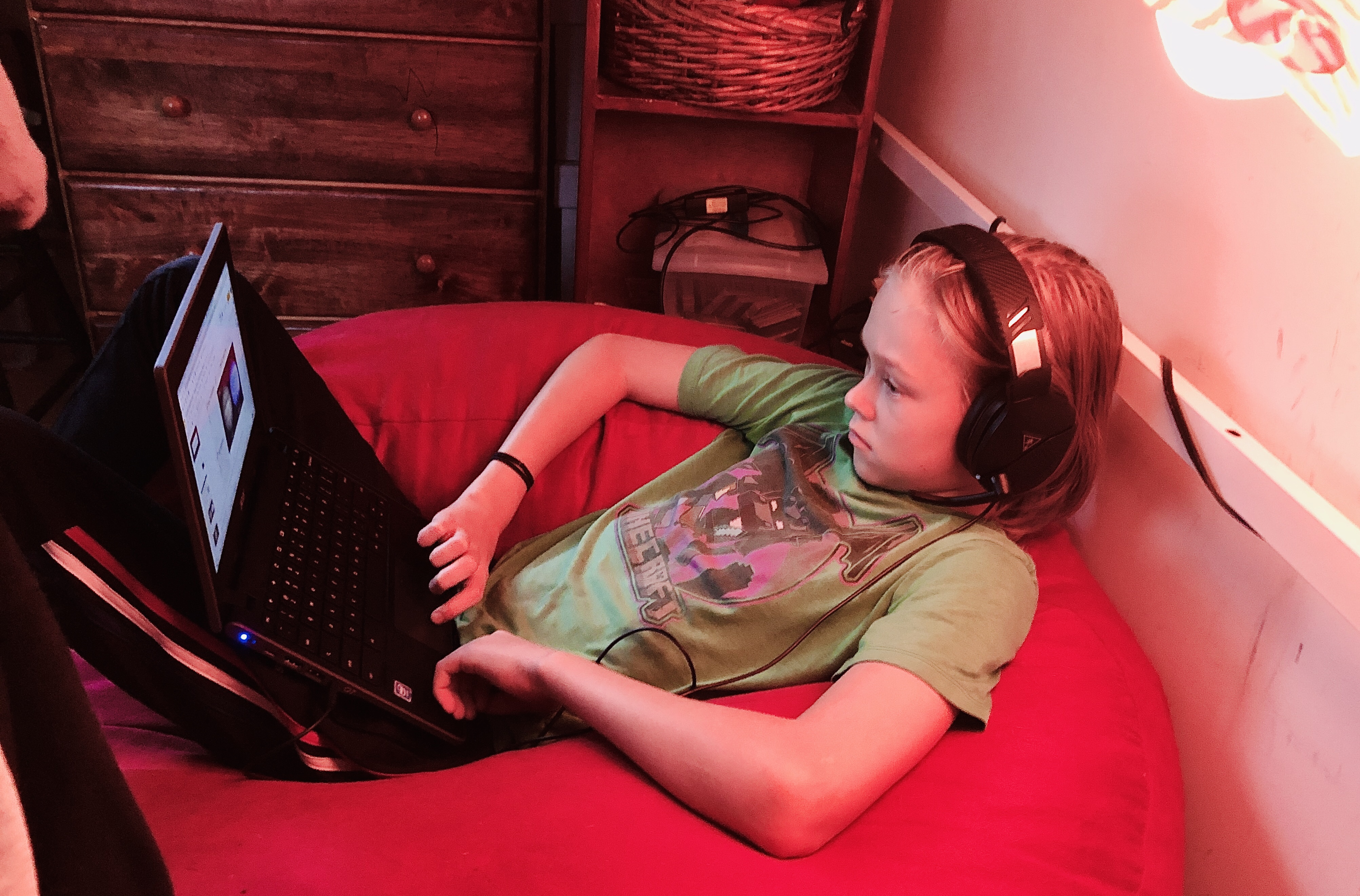 BOY: Bye! [Runs to take his next class over the Chromebook on the beanbag in his bedroom.]