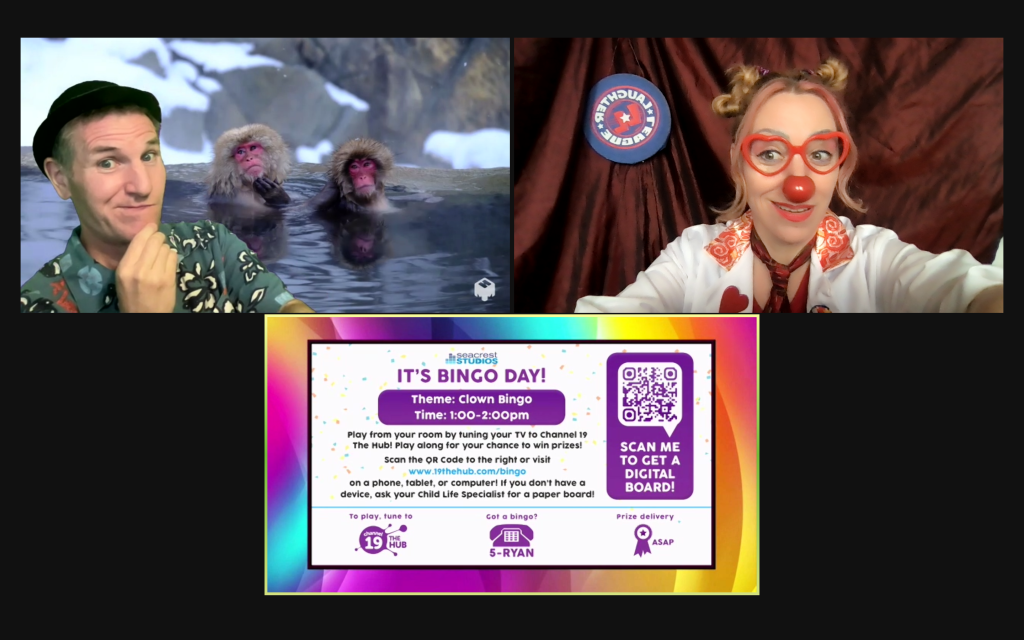 Today’s rounds were performed courtesy of Dr. Mal in plain clothes serving as “Tour Guide” carrying the iPad with two of us clowns on it, geared up and ready to play. As of yet we’re still mostly remote due to Covid in spite of all being vaccinated and rearing to get back in person. Dr. Mal follows all the hygiene and medical protocol and gets us into the room, then it’s up to us to engage the child.