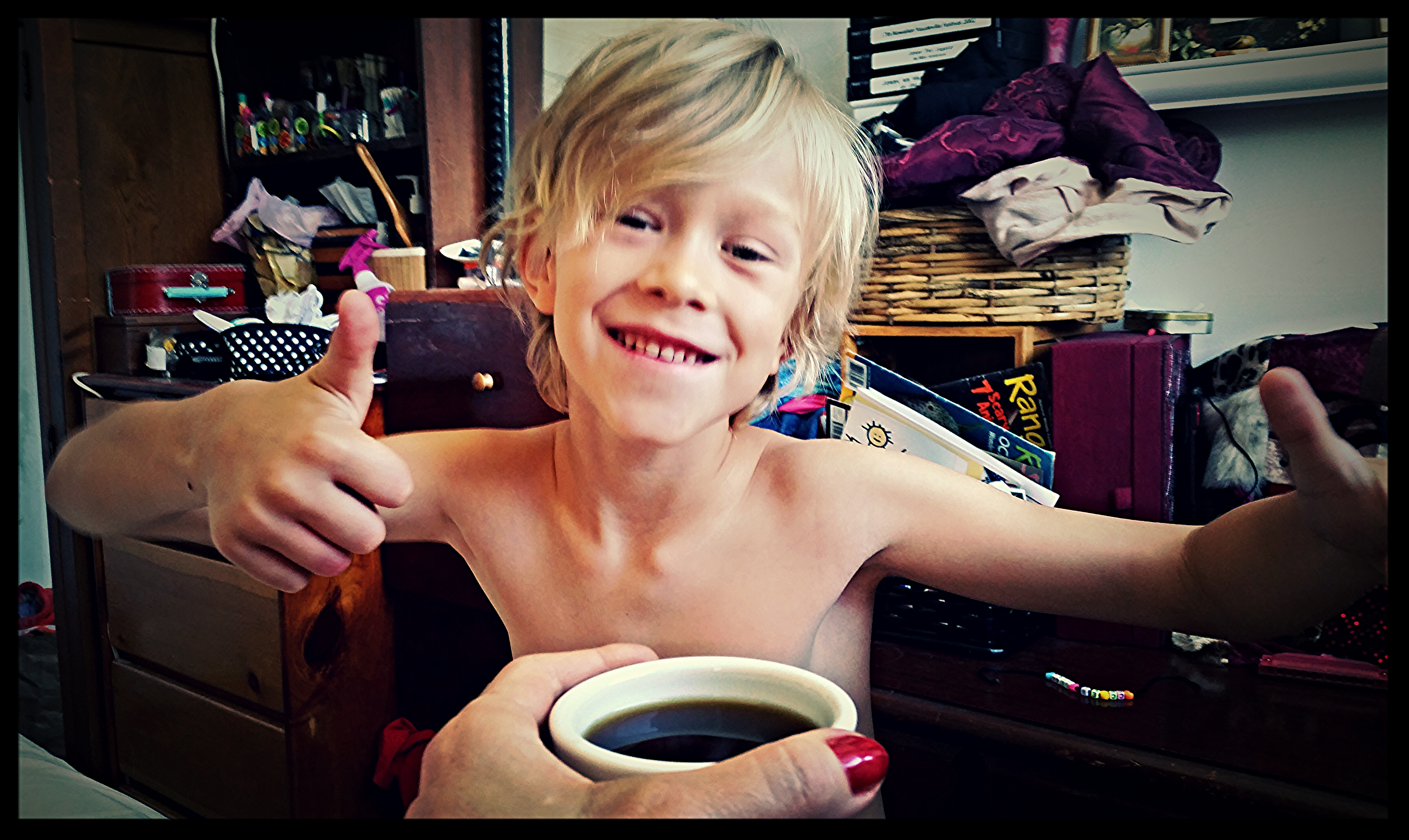 NEWS BULLETIN: On this day in history, my 7 y/o son Gavin fully executed the making and delivering of coffee to us, his parents, who were still in bed. And note; he executed all the steps –soup to nuts (well, grounds to cup)– by himSELF.